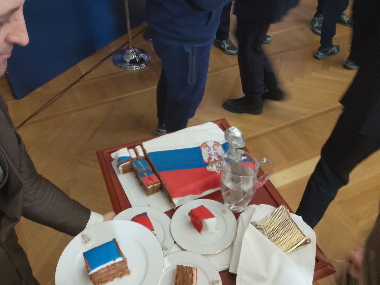 Президент поздравил игроков и тренерский штаб команды, не обошлось и без угощения – вкусного торта в цветах сербского флага.